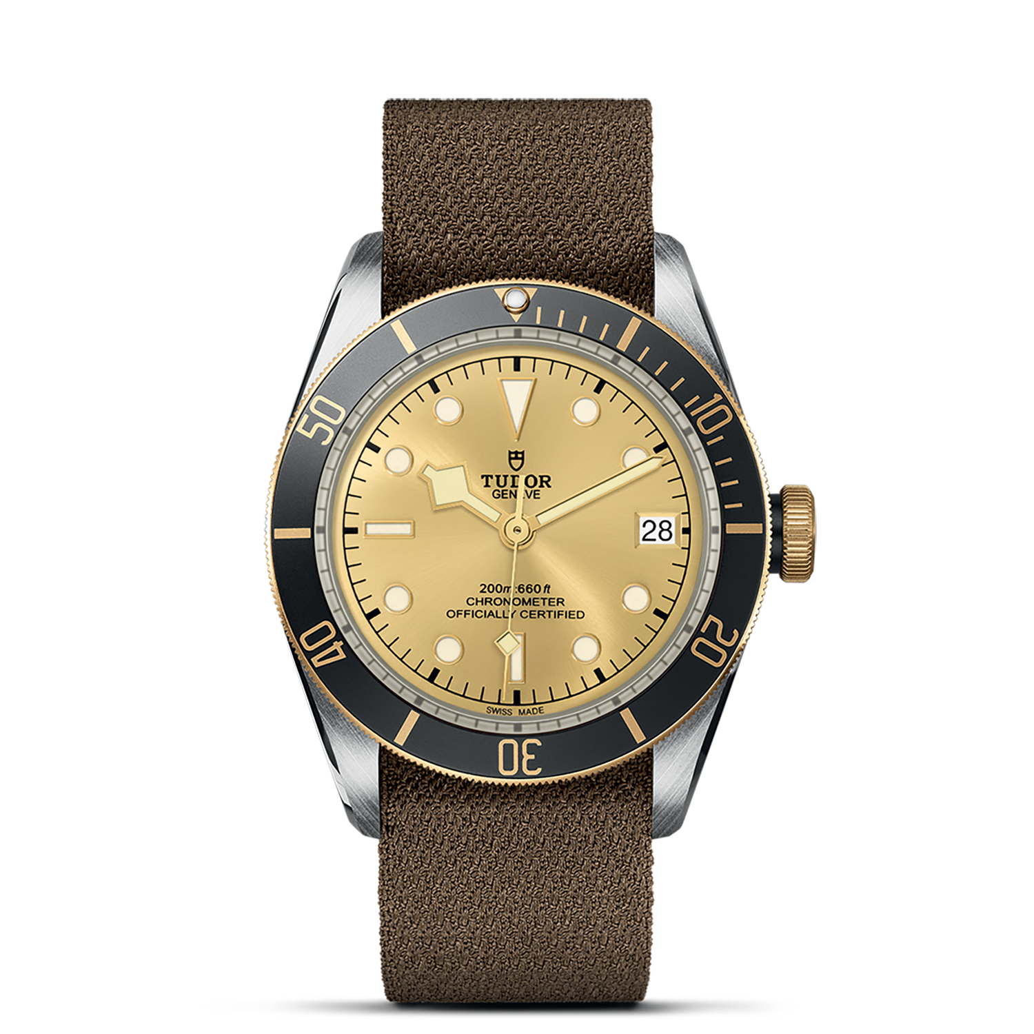 Yellow gold screw-down winding crown, with the TUDOR rose engraved and lacquered in black, with black anodized aluminum winding crown tube