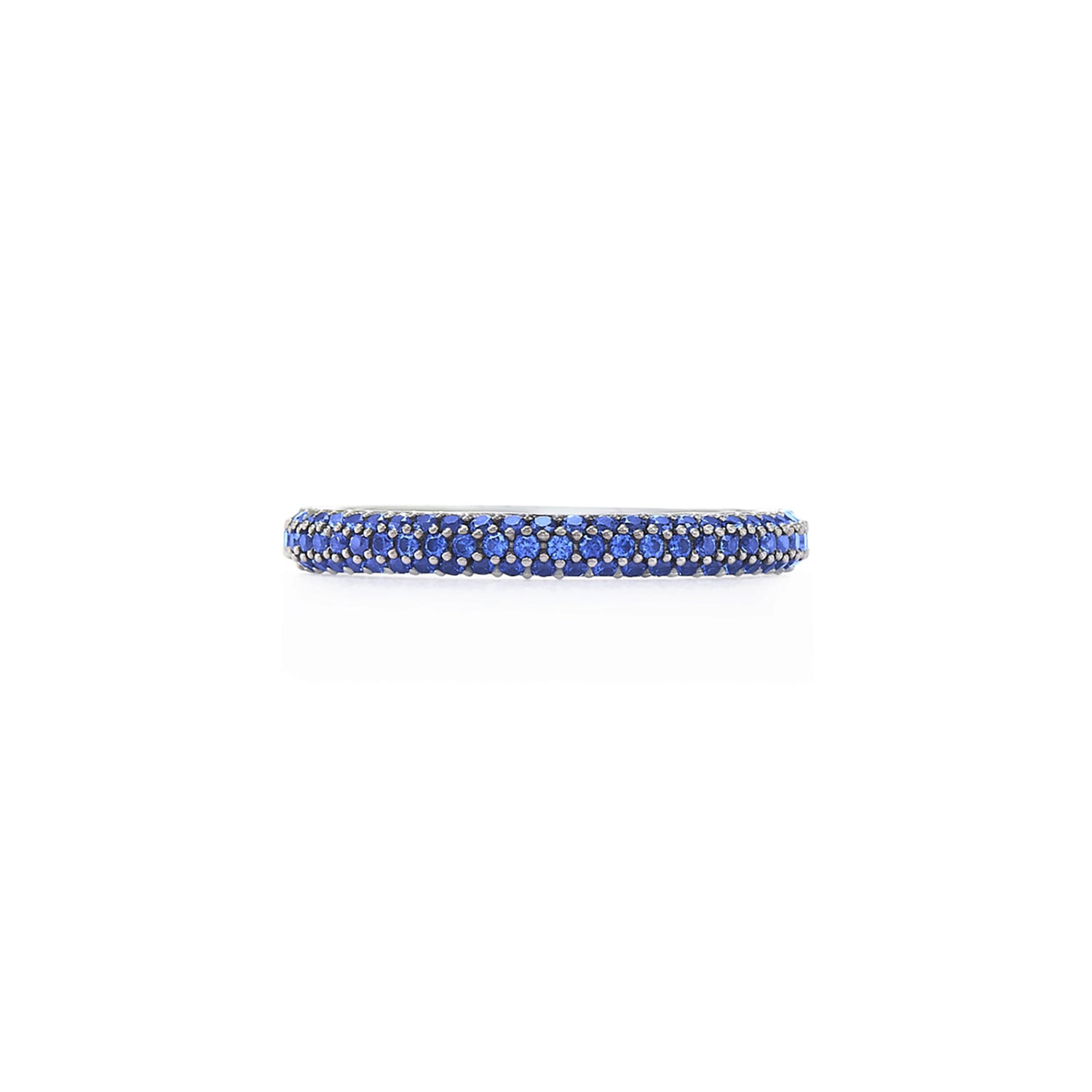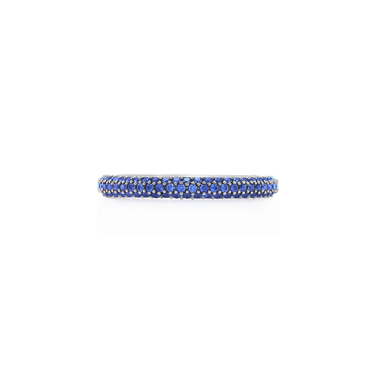 Three rows of vivid sapphires create a moment of rich color in a slim, sparkling ring. This piece epitomizes Kwiat’s superior craftsmanship with gemstones carefully pavé set in 18k white gold. Wear it as a style statement or an unconventional wedding band.