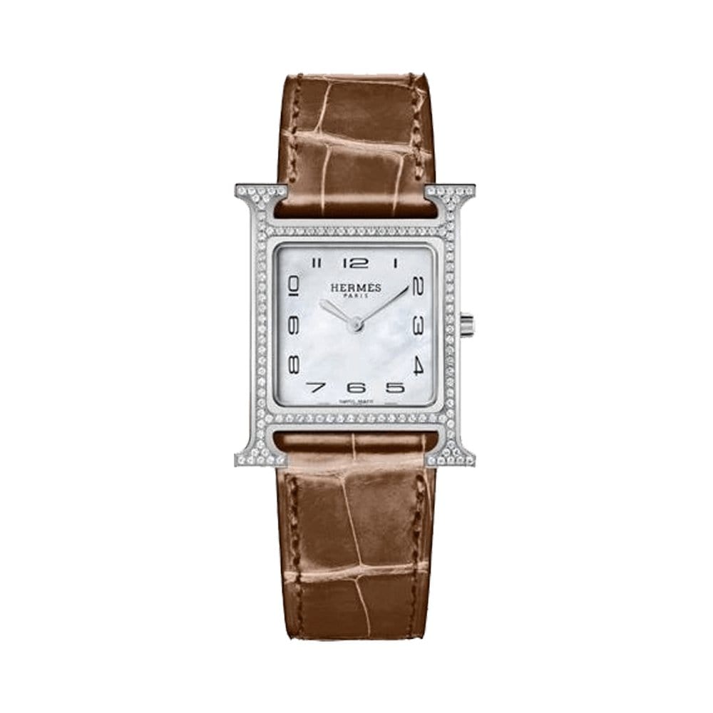 Stainless steel Heure H, white mop dial, arabic numeral index, square polished h with diamond bezel on gris elephant smooth alligator strap with tang buckle