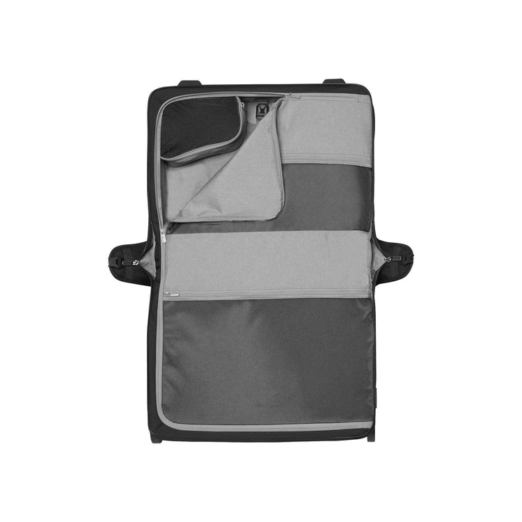 Convenient, wheeled garment carrier lays flat for easy packing and keeps clothes wrinkle-free